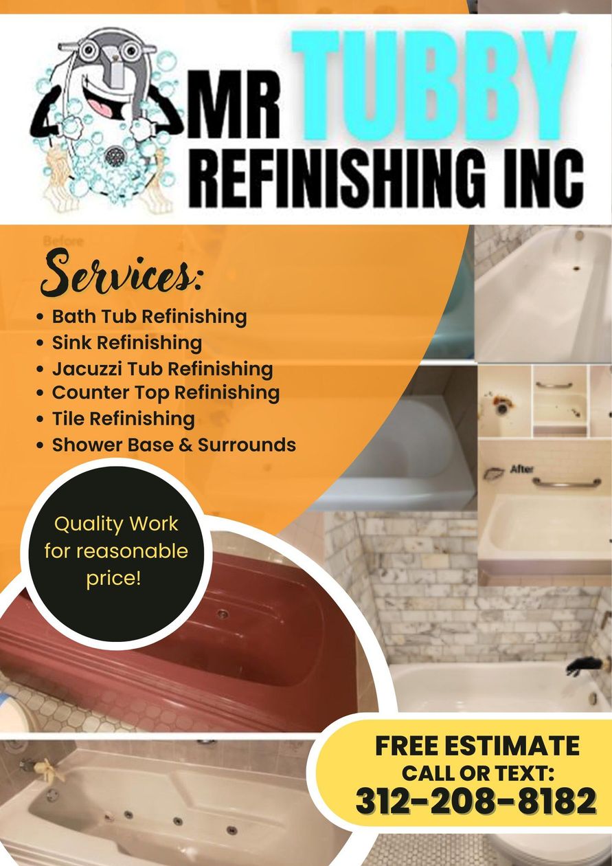 At Mr. Tubby Refinishing Inc, we professionally refinish and reglaze bathtubs, showers, tile, and sinks. Our refinishing process restores worn, stained, or outdated surfaces with a smooth, durable finish that looks like new without the cost, mess, or demolition of a full replacement.